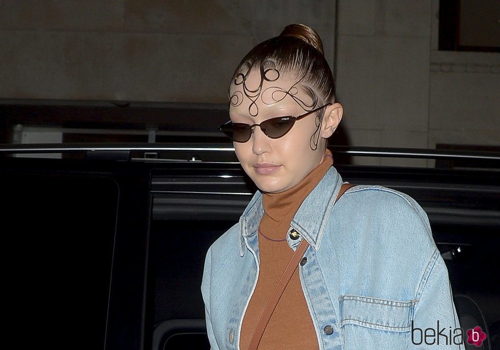 La modelo Gigi Hadid pasea por Nueva York con un feo peinado con pelos pegados en la frente como haciendo figuras.