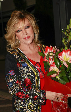 Lydia Lozano cumple 56 años y para su día elige un look en tonos rojos a juego con su vestido negro y el ramo de flores, el 12 de diciembre del 2016 en Madrid.