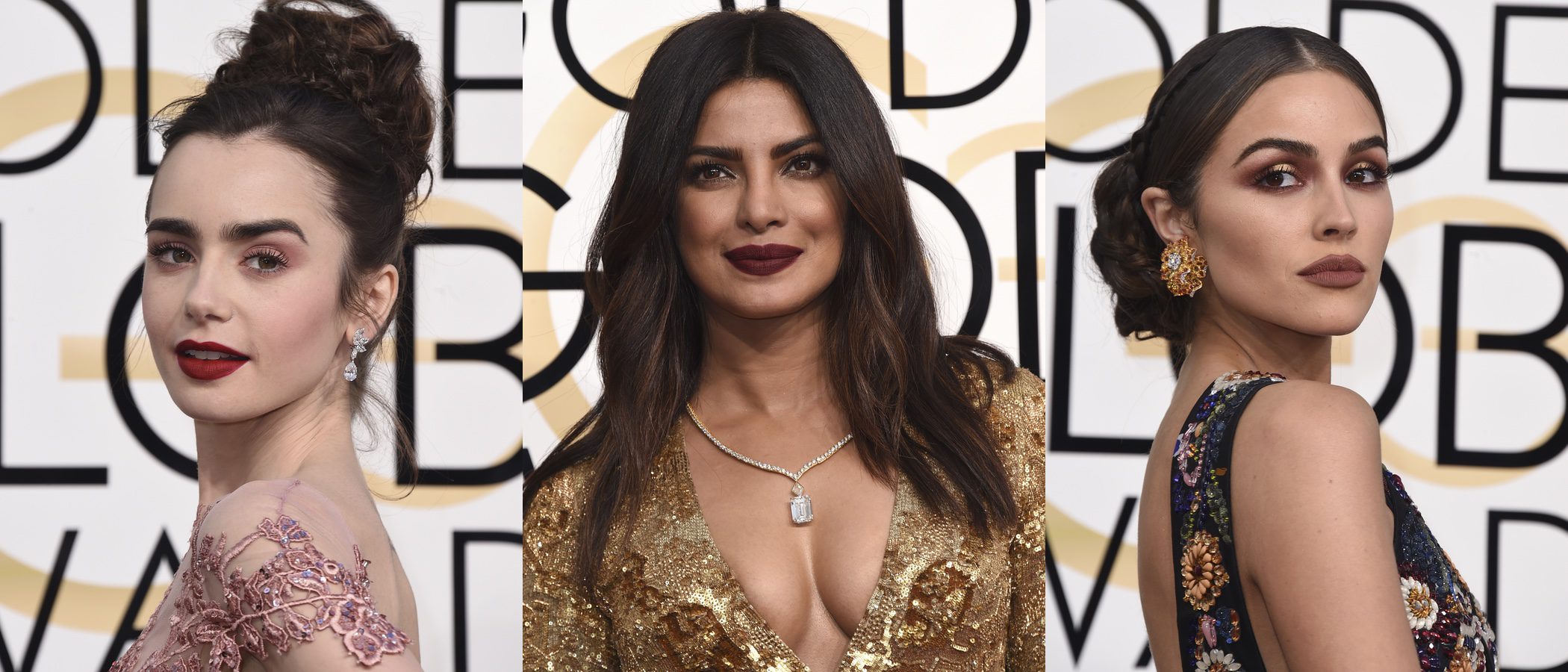 Quién sí decidió dejar su melena suelta sin embargo fue Priyanka Chopra, que a diferencia de Lily Collins paseó la alfombra roja de los premios con un look más sencillo donde unos labios oscuros tomaban el protagonismo. La actriz de 'Quantico' optó por un maquillaje radiante utilizando iluminador en lo alto de sus mejillas y un colorete en tonos tierra con ese acabado satinado que tan bien complementaba su highlighter. Contrastando con su labial burdeos Chopra optó en los ojos por algo más luminoso que atrajera luz a su rostro, maquillándolos con una sombra de color gris con partículas plateadas de glitter.
