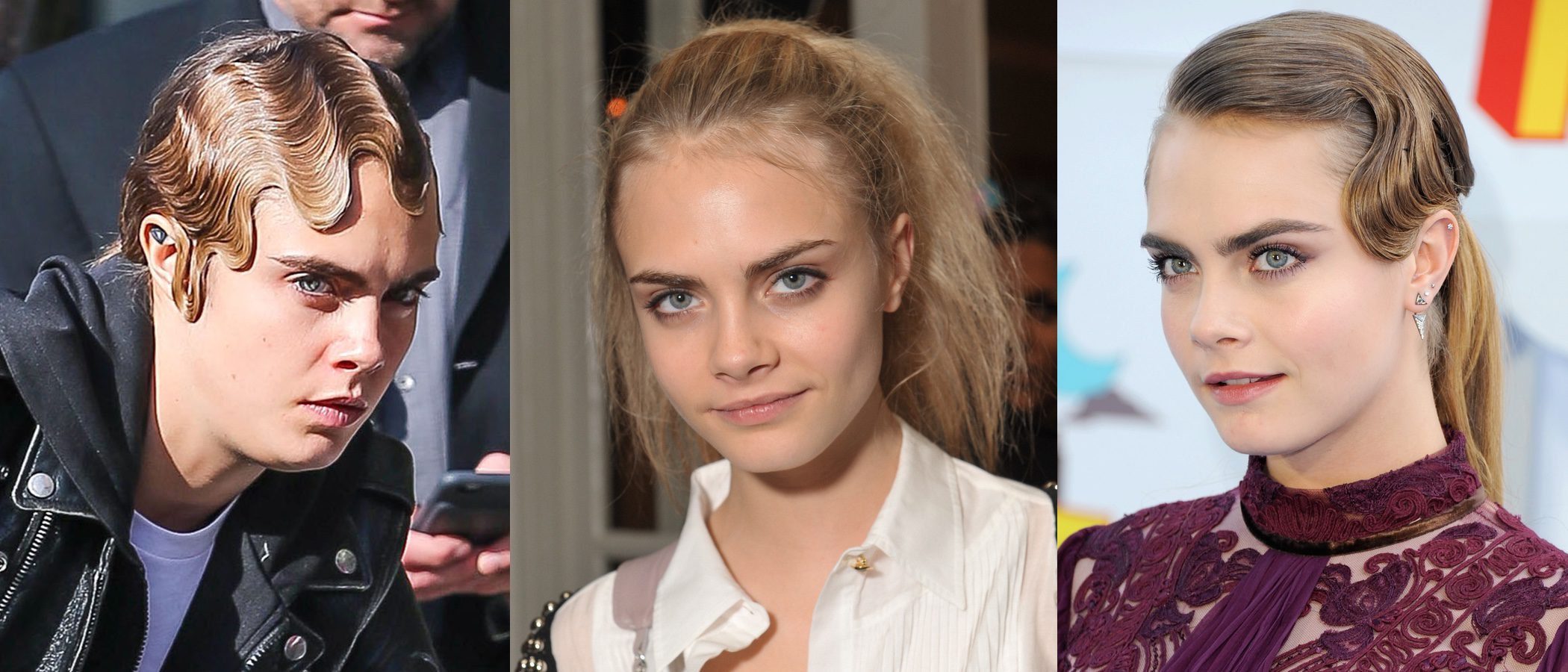 Cara Delevingne recoge su cabello en una coleta trasera y añade una única onda de aguaPeinado arrugado