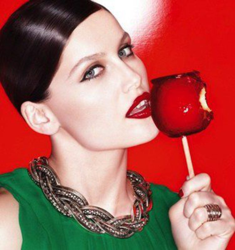 Para esta ocasión, Laetitia ha posado luciendo un look de aires sesenteros con un vestido verde y un maxi collar plateado sobre un fondo rojo, sin duda, el color protagonista. Además, en la instantánea la actriz sostiene una manzana de caramelo (también de color rojo), de un color muy similar al de sus labios.