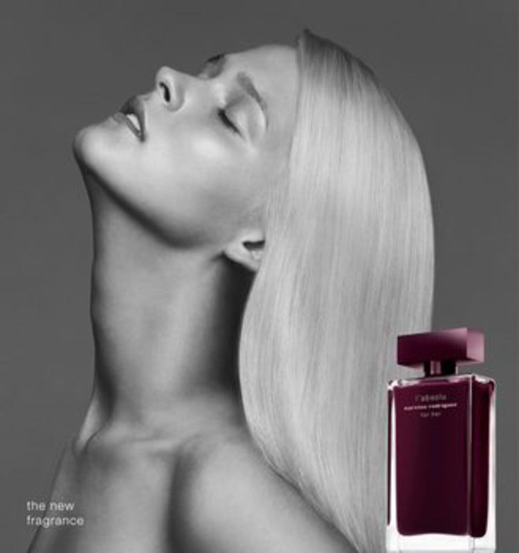 La modelo aparece en primer plano luciendo melena y con los ojos cerrados en una imagen my evocadora en blanco y negro con la que se pretende que todas las miradas se fijen en el envase de 'For Her L'Absolu', que sí tiene color.